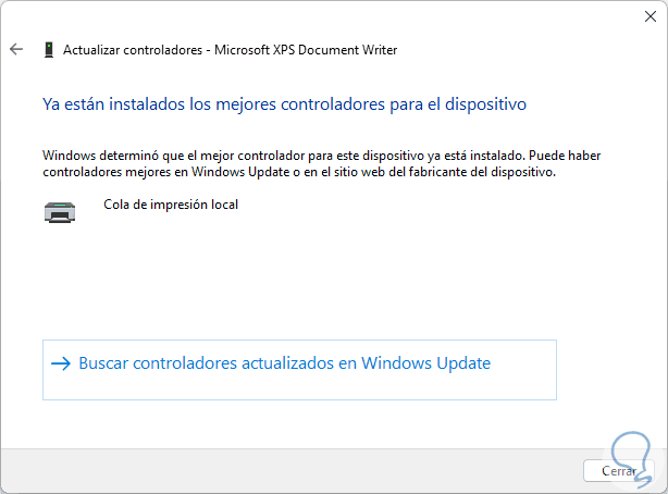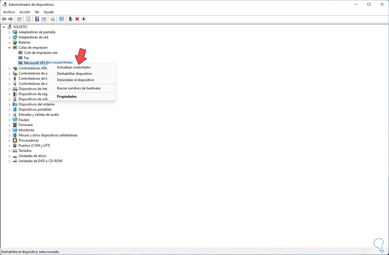 Vamos a "Colas de impresión", damos clic derecho sobre la impresora y seleccionamos "Actualizar controlador":