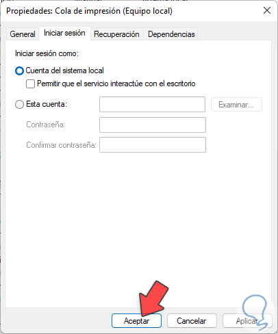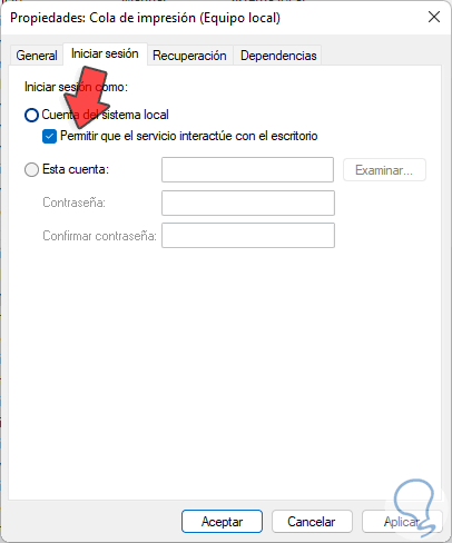En esta misma ventana podemos evitar la interacción del servicio con el escritorio, no es algo que suceda frecuentemente, pero si llegase a pasar puede tener una repercusión en el comportamiento, para prevenir esto, en la pestaña Iniciar sesión desactiva la casilla "Permitir que el servicio interactúe con el escritorio":