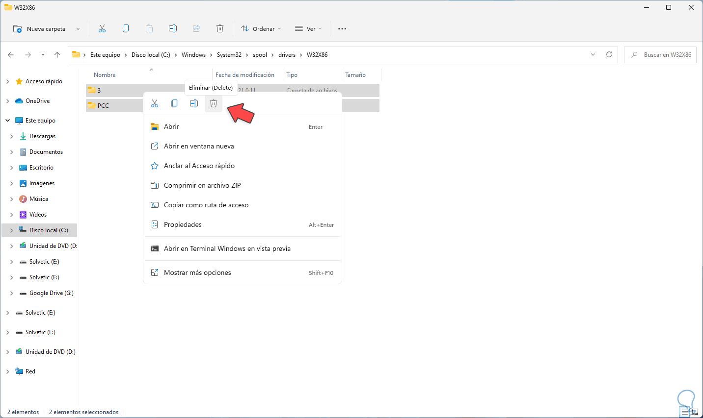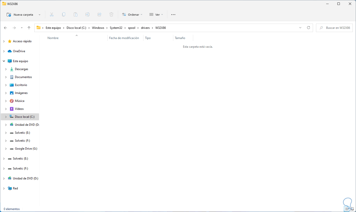 En primer lugar, vamos a la ruta "C:\Windows\System32\spool\drivers\W32X86", borra el contenido de esta carpeta: