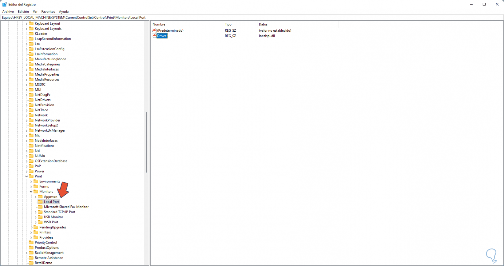 HKEY_LOCAL_MACHINE - SYSTEM - CurrentControlSet - Control - Print - Monitors - Local PortValida que esté el valor DWORD “Driver” con el valor “localspl.dll”.