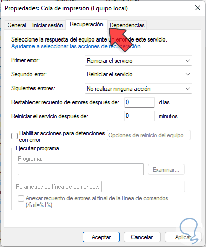 Ahora haremos uso de las opciones de recuperación con la cual es posible determinar qué acción será ejecutada cuando el servicio falle, , vamos a la pestaña “Recuperación” donde veremos lo siguiente: