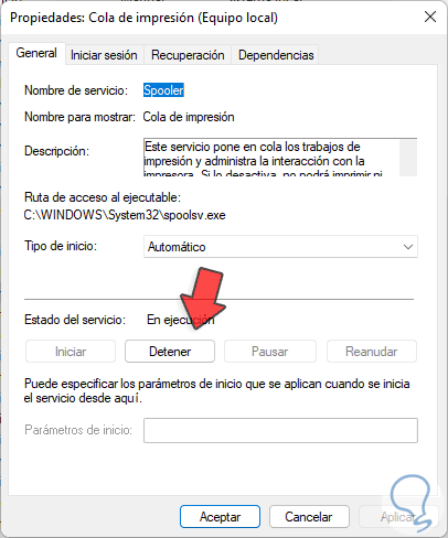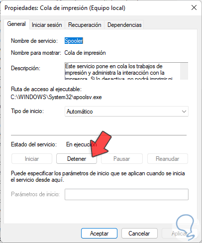 Damos clic en "Detener" para detener el servicio de impresión. Luego damos clic en "Iniciar" para iniciarlo de nuevo, este proceso de reinicio ayudara a que la cola de impresión trabaje de forma correcta en Windows 11.