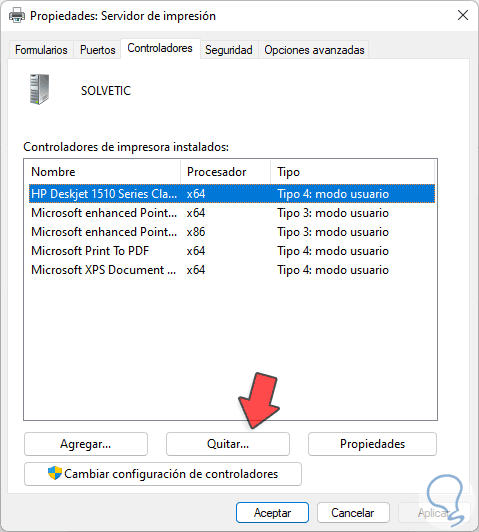 Ahora selecciona la impresora y da clic en "Propiedades del servidor de impresión", en la pestaña “Controladores” selecciona los controladores y bórralos: