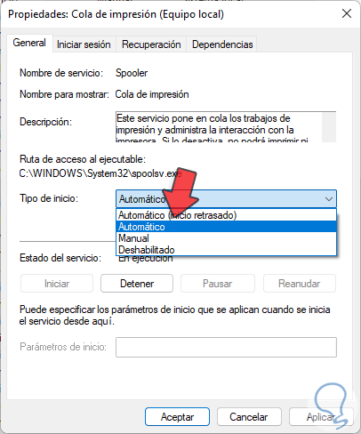 Ahora vamos a validar que el servicio de impresión este siendo iniciado de forma automática, esto significa que siempre estará activo, en caso de no ser así el proceso puede estar detenido o debería ser ejecutado manualmente, para validar esto, en el campo "Tipo de inicio" debe estar el valor automático:
