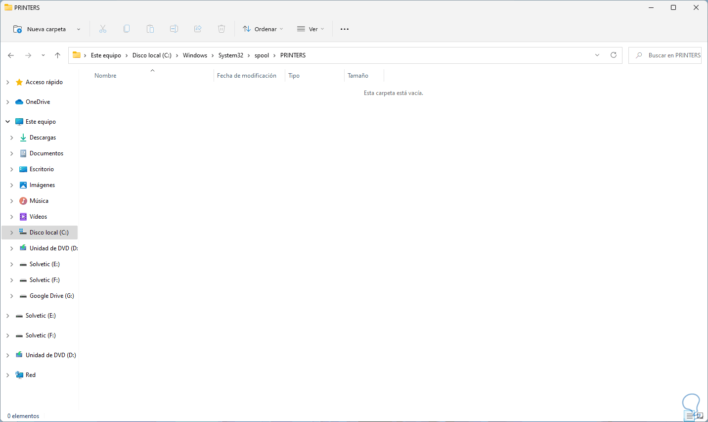 Ahora vamos a la ruta "C:\Windows\System32\spool\PRINTERS" y allí borramos el contenido de ésta: