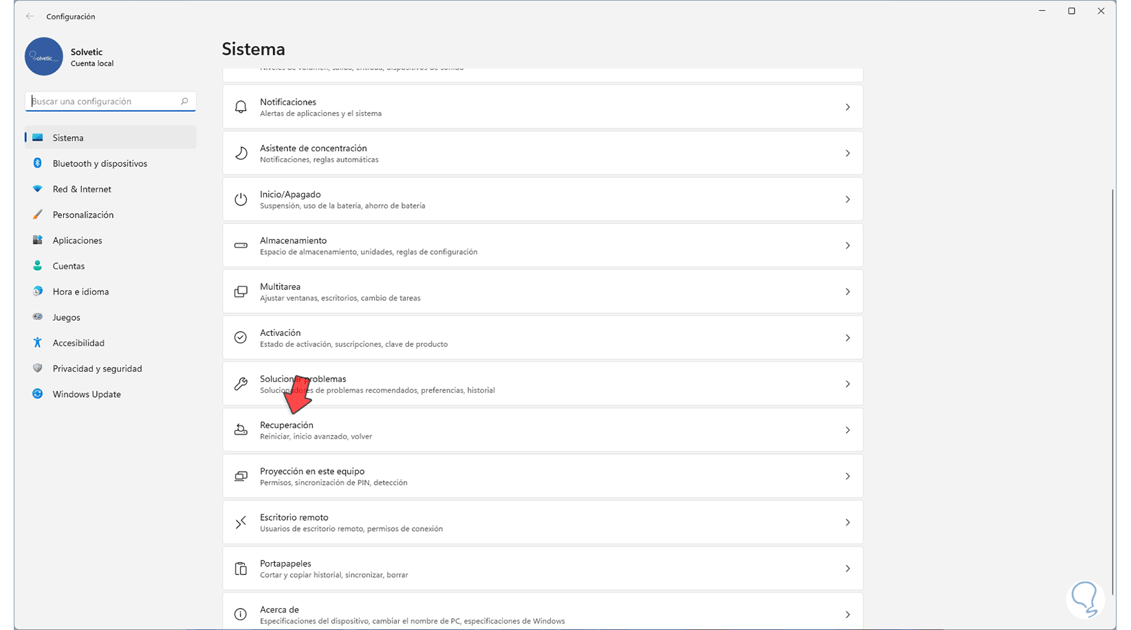 Para este proceso buscamos realizar un análisis en el sistema de archivos de Windows 11, pero no de la forma normal sino en modo seguro para un análisis mas integral, para lograrlo, abre Configuración y ve a "Sistema - Recuperación":