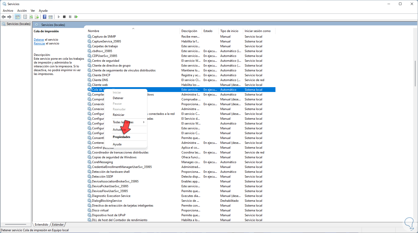Damos doble clic sobre el servicio "Cola de impresión" y luego seleccionamos "Propiedades":
