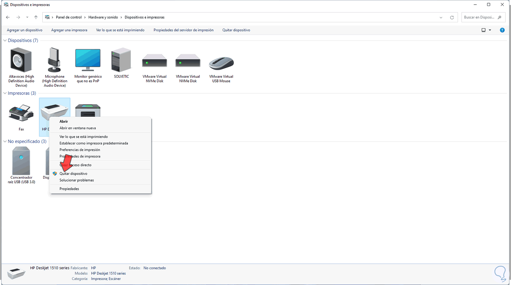 Da clic en "Ver dispositivos e impresoras" , luego da clic derecho sobre la impresora y selecciona "Quitar dispositivo":