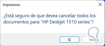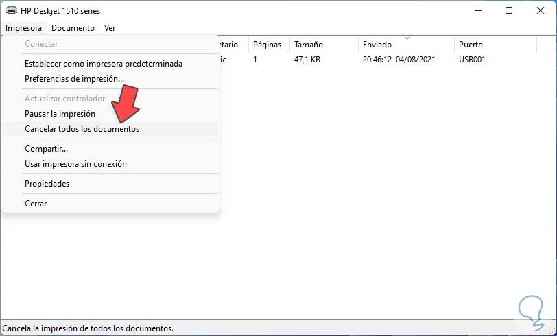 En la ventana emergente vamos a "Impresora - Cancelar todos los documentos":