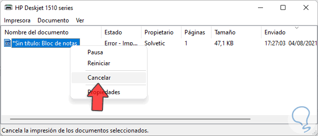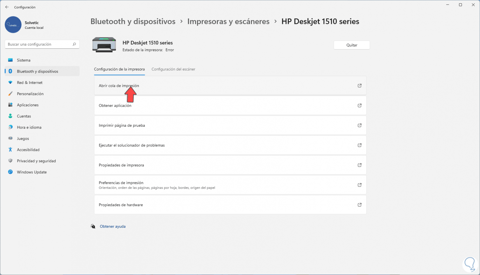 Da clic en la impresora con error, luego selecciona "Abrir cola de impresión":