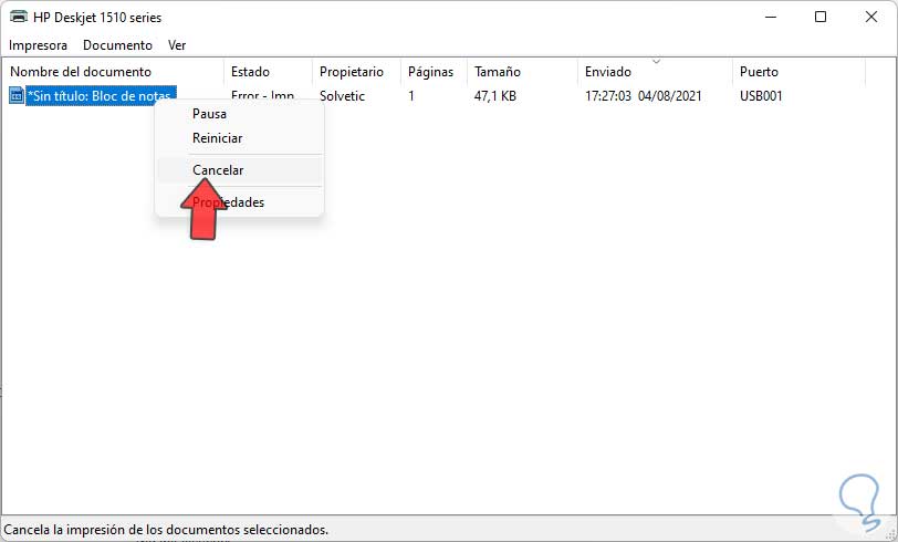 Será abierta una ventana emergente, damos clic derecho sobre el documento y selecciona la opción "Cancelar":