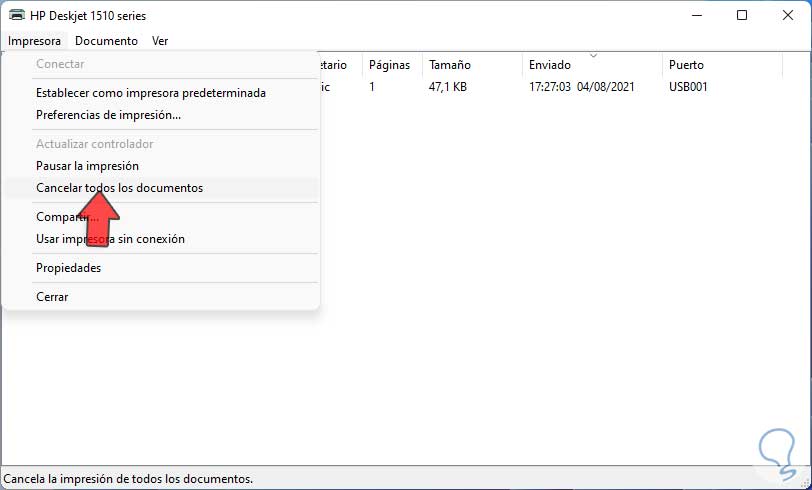 En la ventana emergente, vamos a "Impresora - Cancelar todos los documentos". Aplica los cambios.