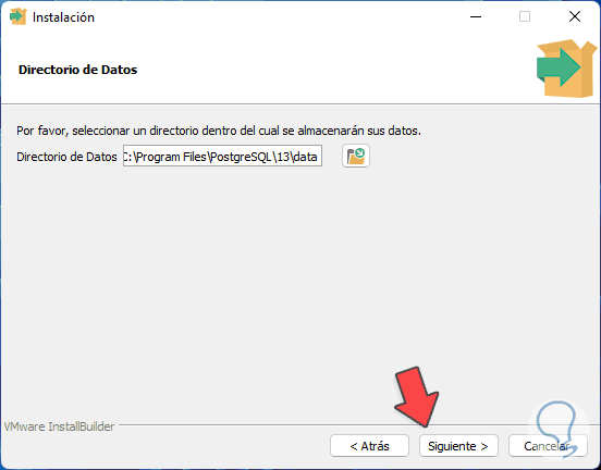 Damos clic en Siguiente para definir donde se instalará el directorio de datos de PostgreSQL: