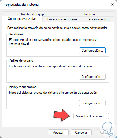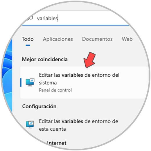 Esta ruta debemos añadirla a las variables de Windows 11, busca "variables" en el buscador y selecciona "Editar las variables de entorno del sistema":