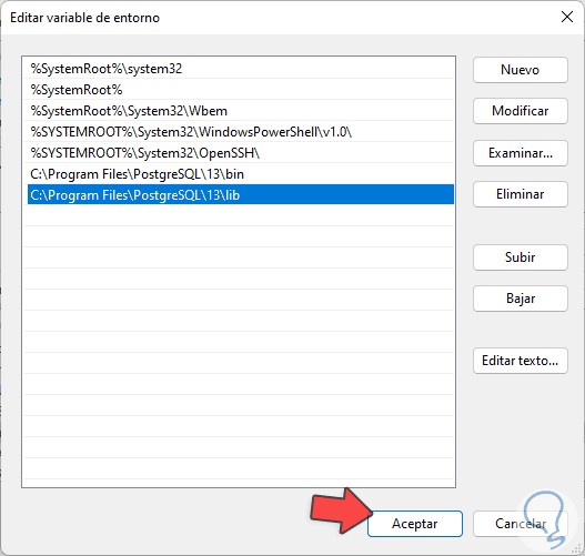 De nuevo clic en Nuevo e ingresa "C:\Program Files\PostgreSQL\13\lib": Aplica los cambios.
