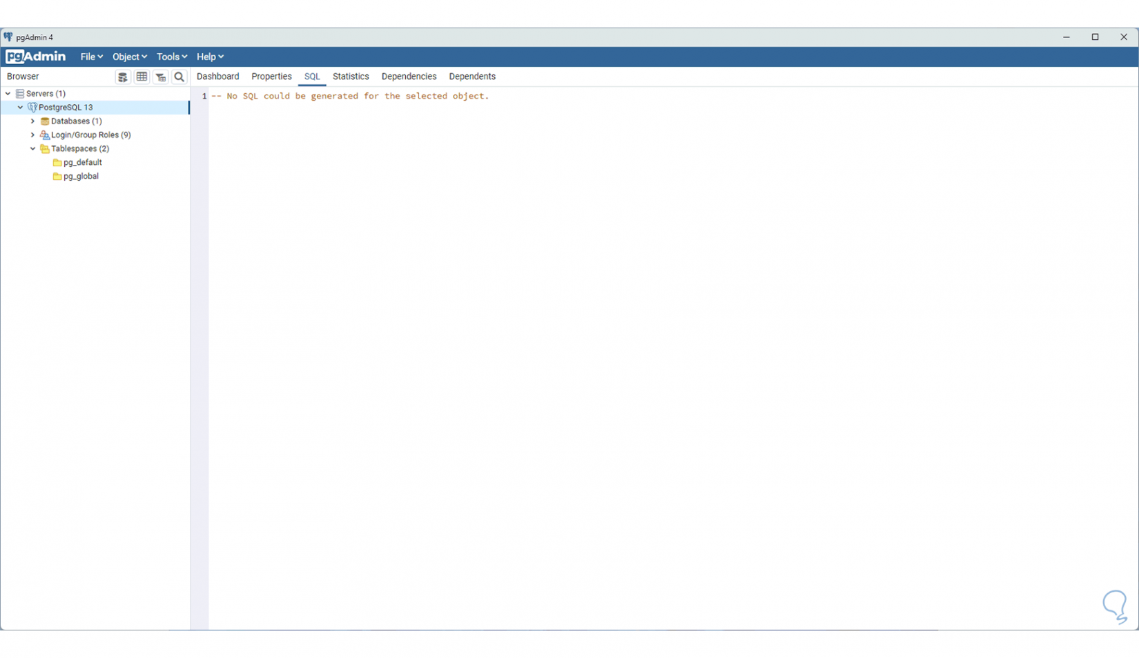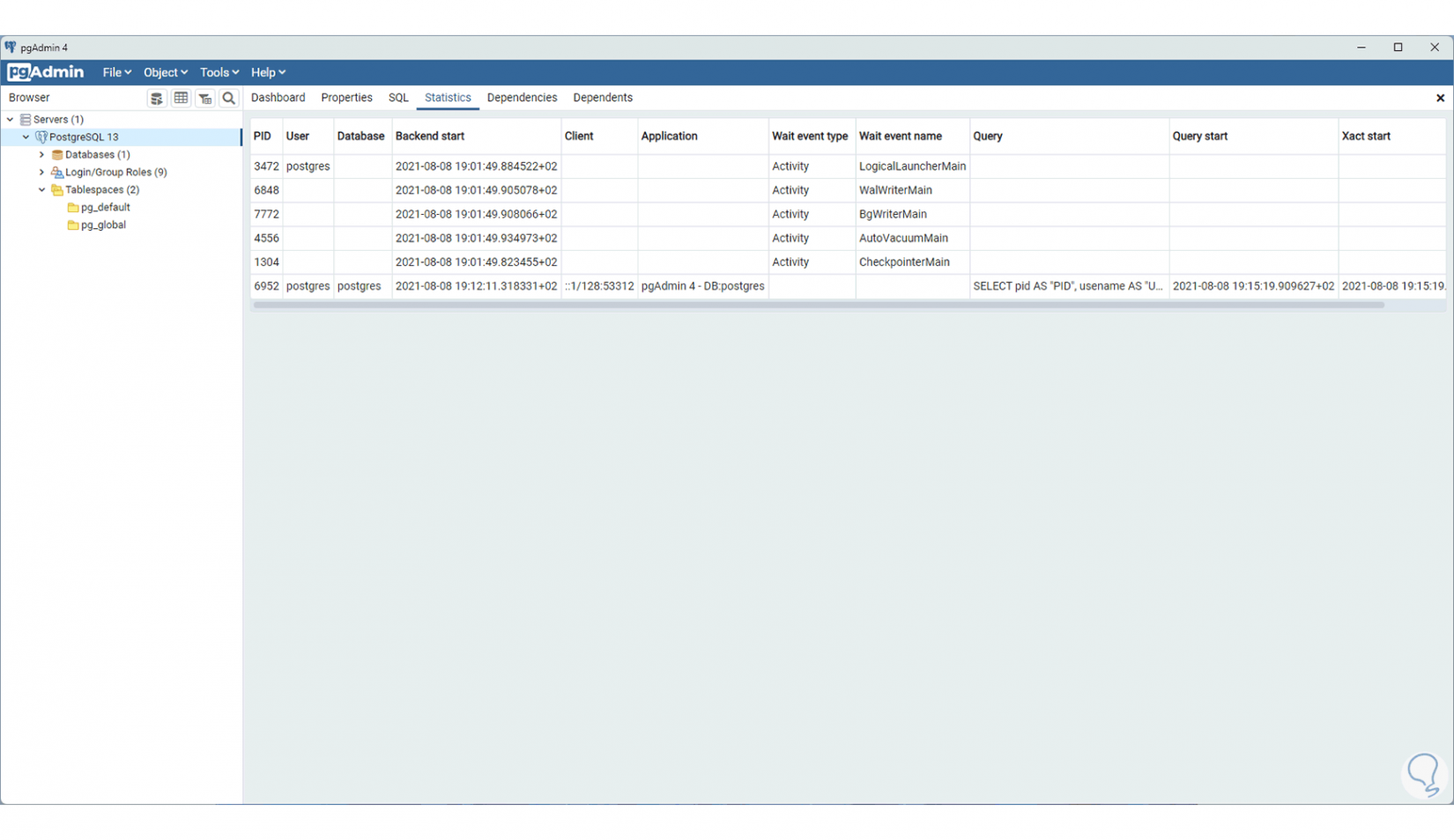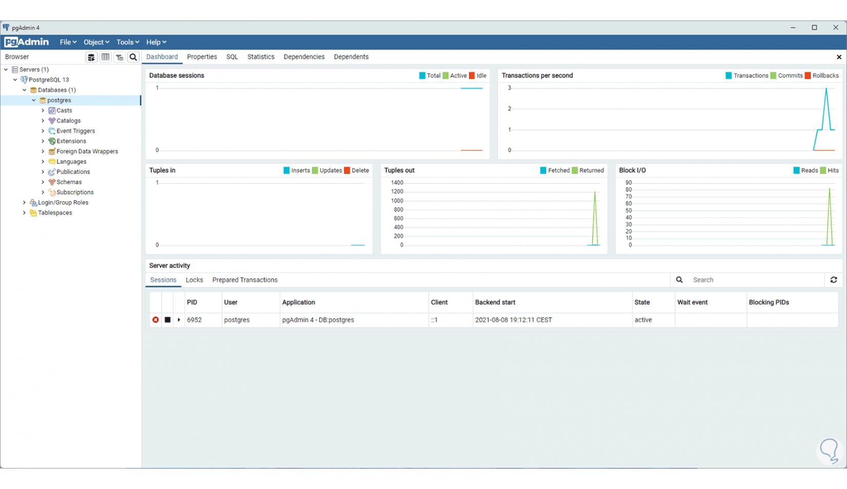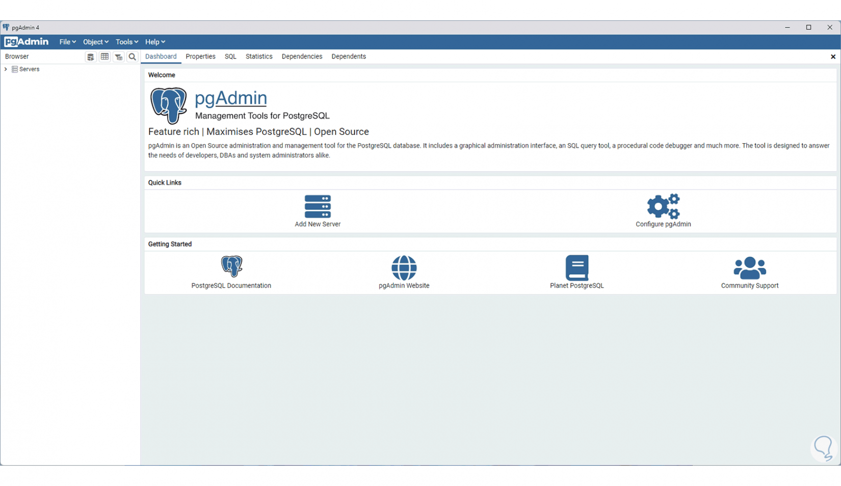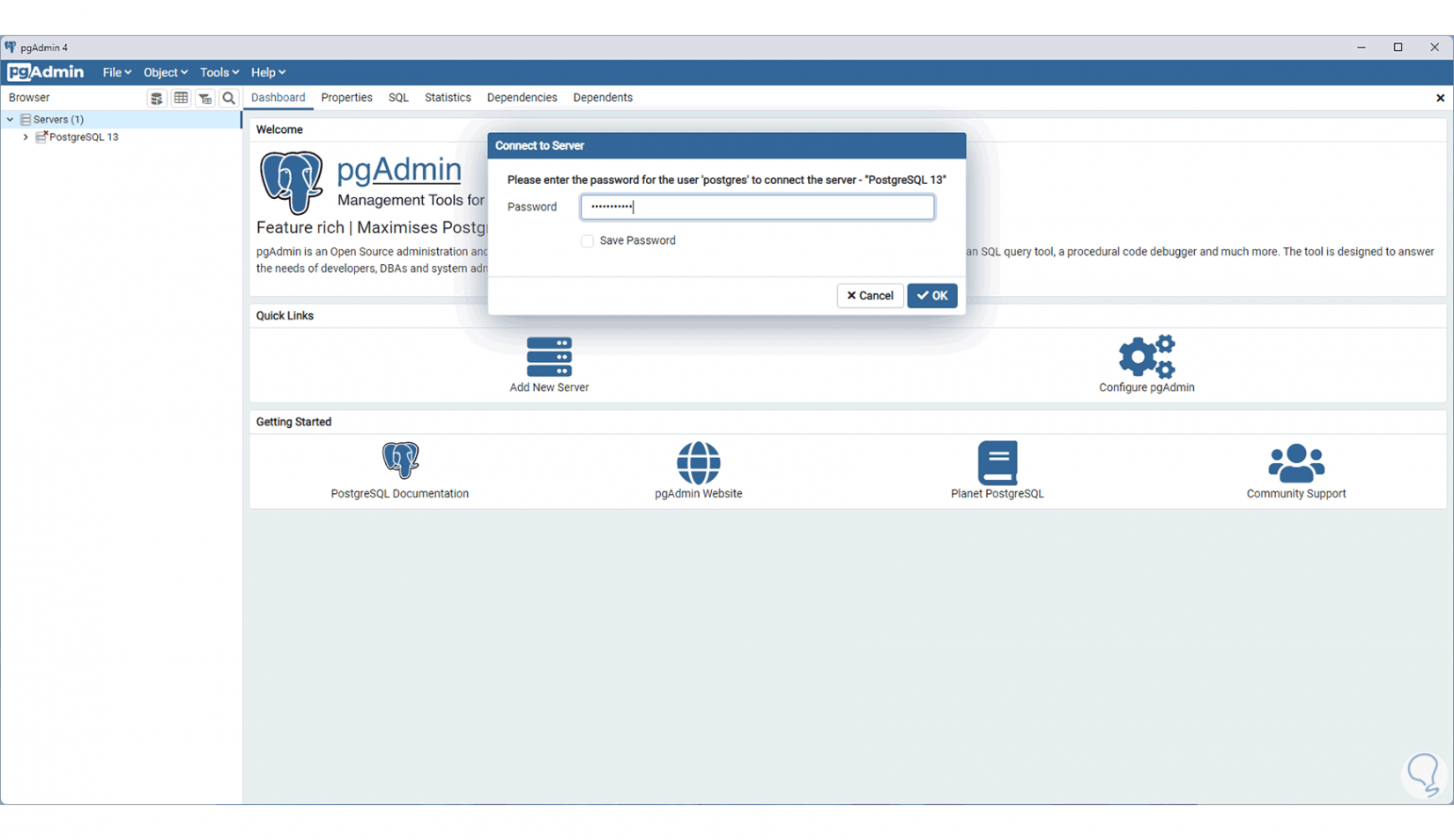 Da clic en OK para acceder al panel general de PostgreSQL en Windows 11: