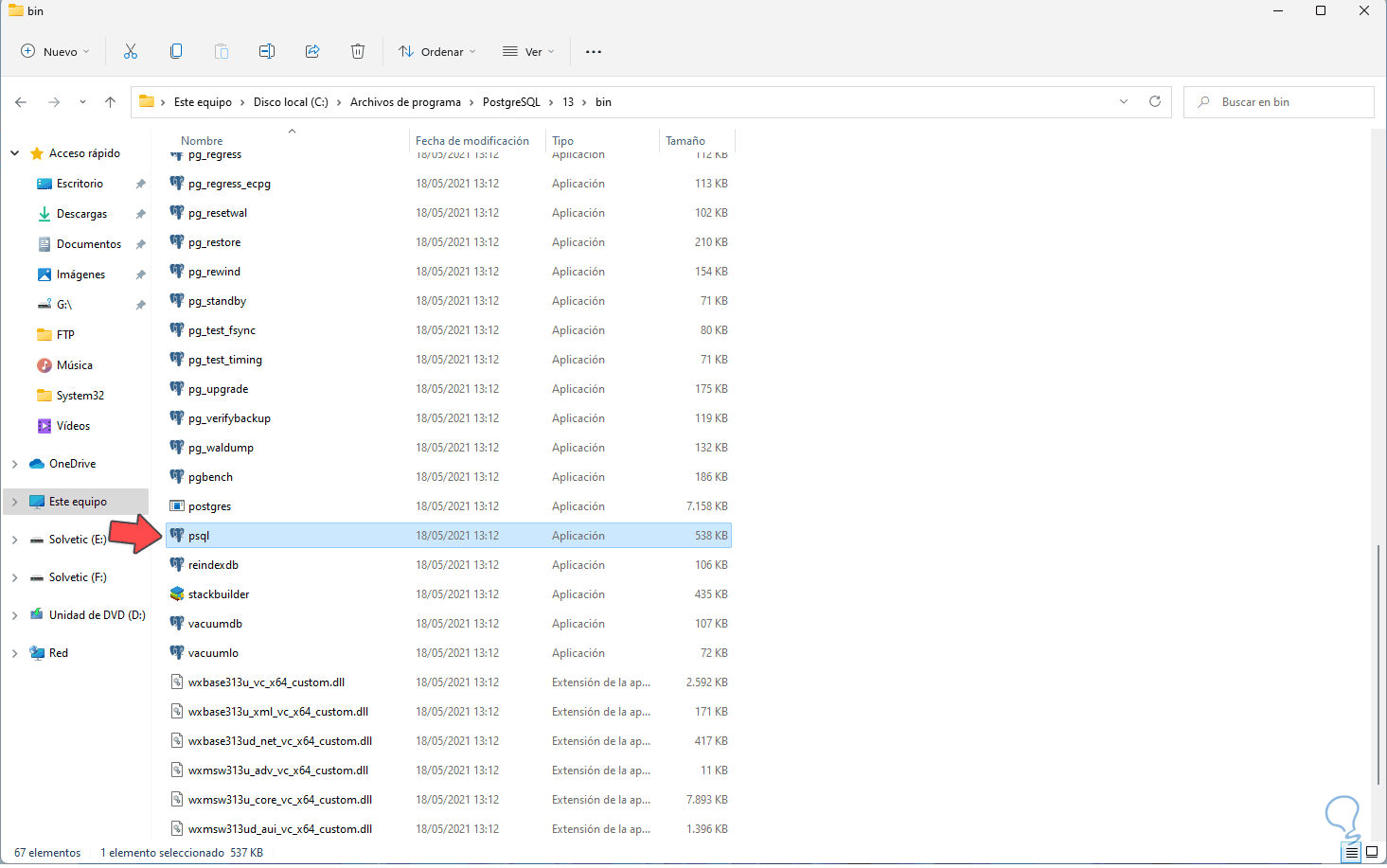 Ahora abre el Explorador de archivos y ve a la ruta "C:\Program Files\PostgreSQL\13\bin": Validamos que exista el archivo "psql".