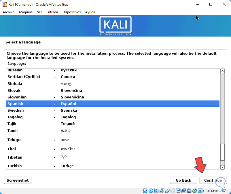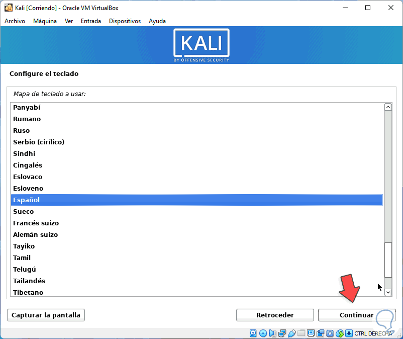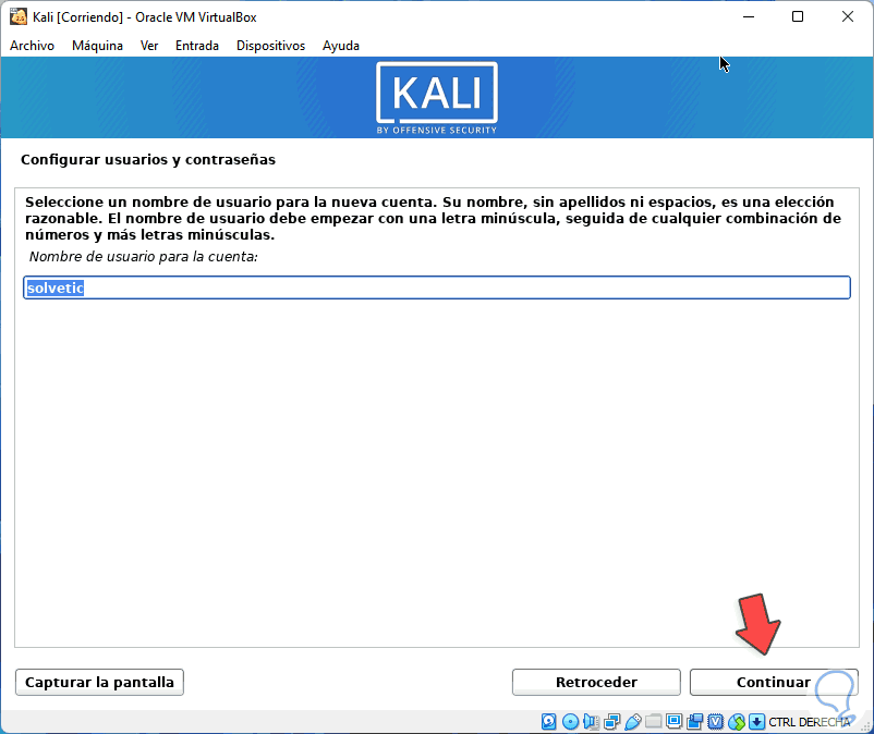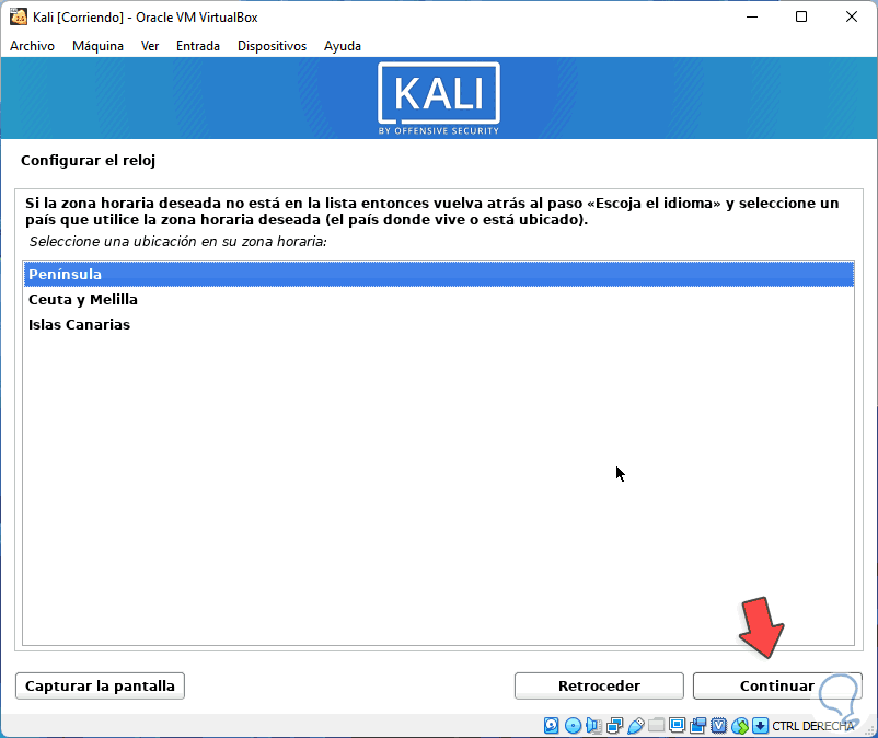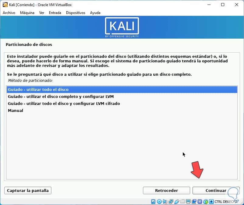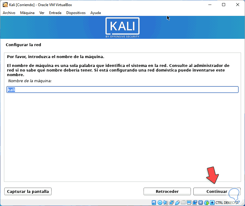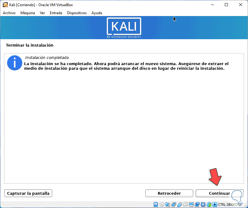 Damos clic en Continuar para iniciar la instalación de Kali Linux en VirtualBox: