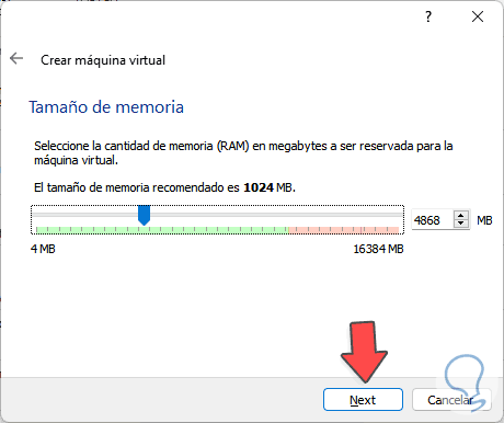 En la siguiente ventana asigna la memoria RAM a la máquina virtual: