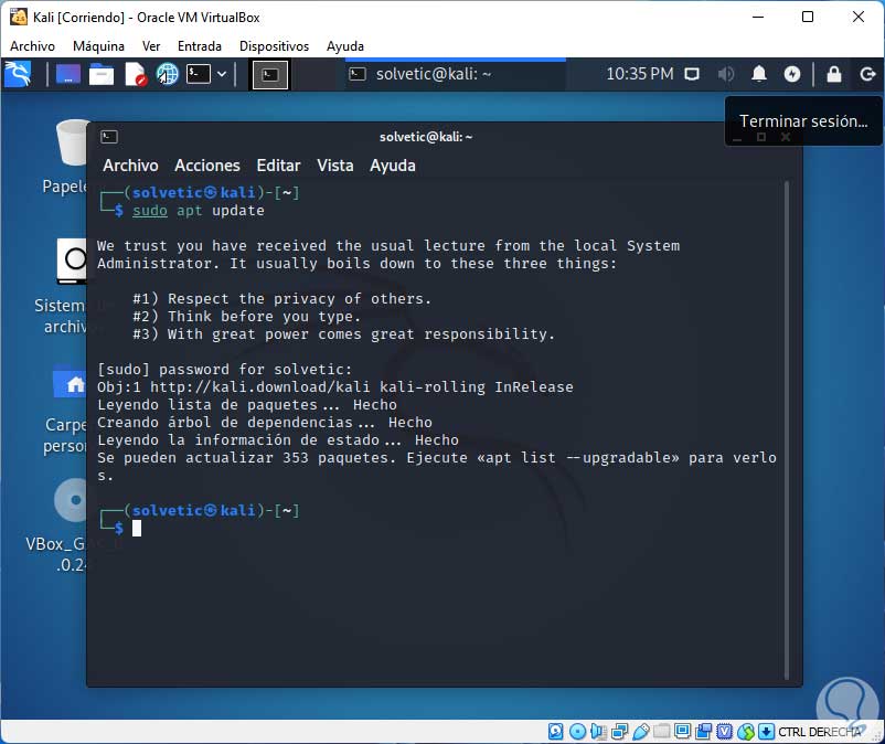 Abre la terminal en Kali y ejecuta "sudo apt update":