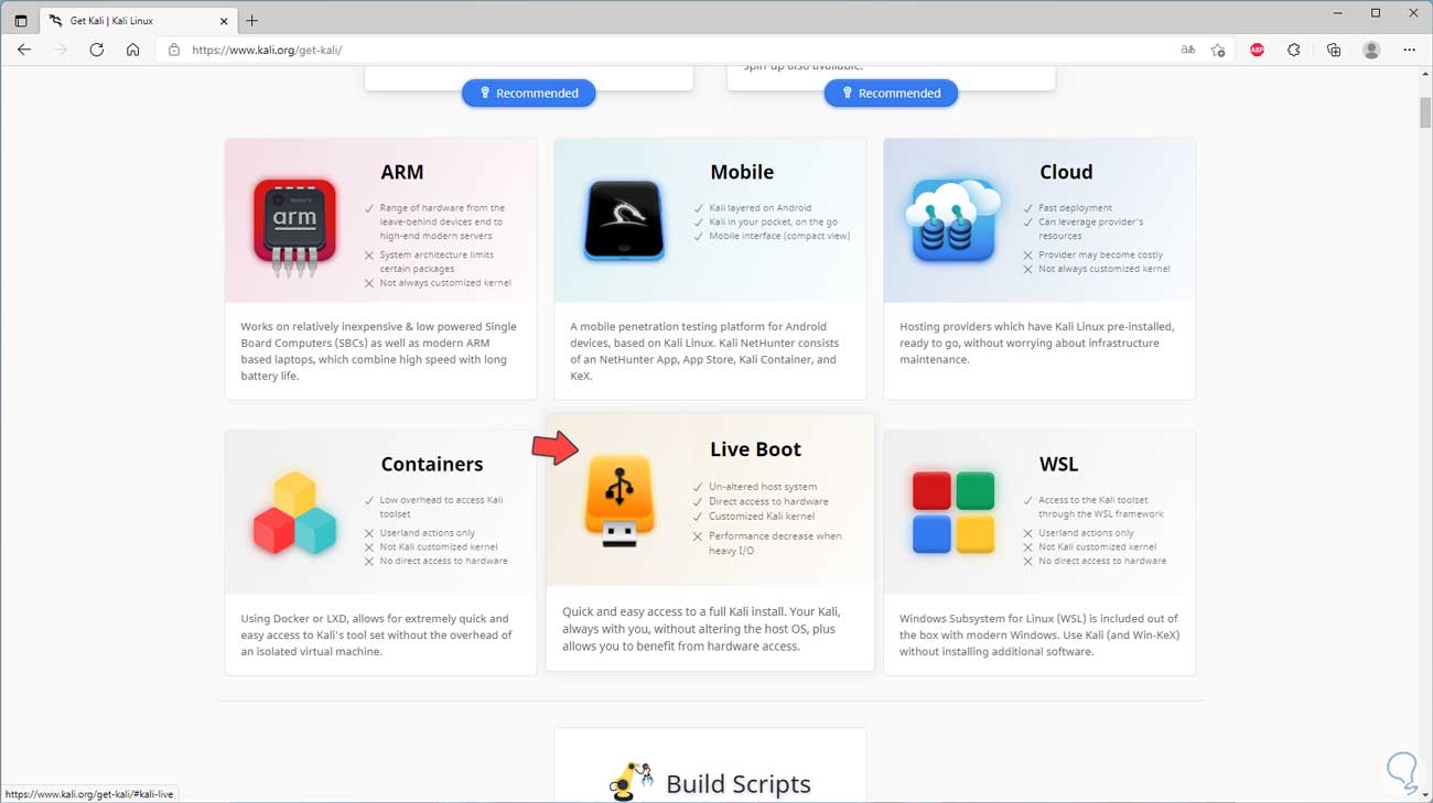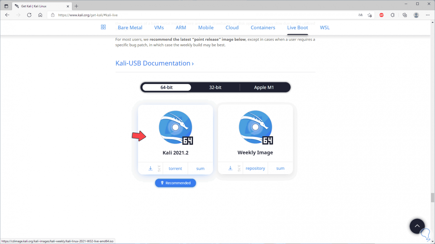 Da clic en "Live Boot" y veremos lo siguiente. Selecciona la descarga en base a la arquitectura deseada (32 o 64 bits).