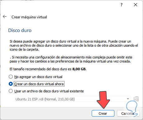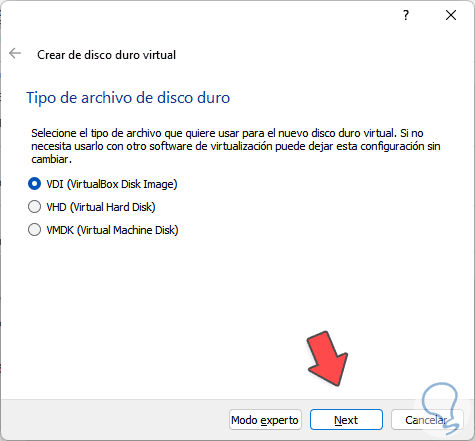Elegimos el tipo de archivo del disco duro y en la siguiente ventana seleccionamos el almacenamiento de este disco virtual: