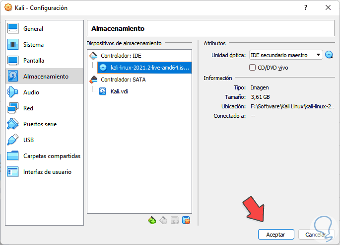 Abrimos Configuración y vamos a "Almacenamiento", damos clic en el icono de CD para seleccionar la imagen ISO de Kali Linux que hemos descargado: