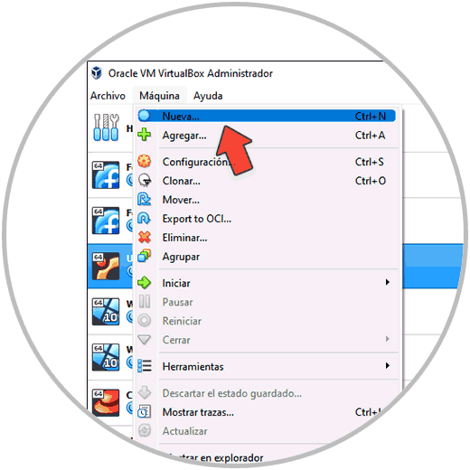 Abre VirtualBox y crea la máquina virtual desde el menú Maquina – Nueva o usando las teclas siguientes: