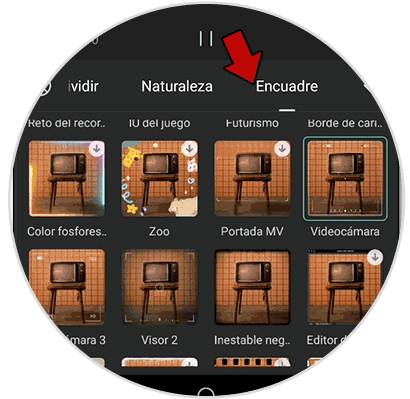 Vamos a "Encuadre" y veremos que hay varios con efecto de grabación de videocámara, elige el que más te guste.
