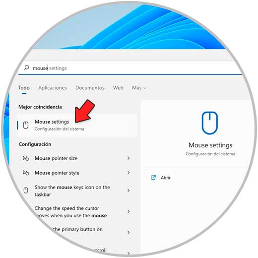 Para este método, en el buscador ingresa "mouse" y allí seleccionamos "Mouse settings":