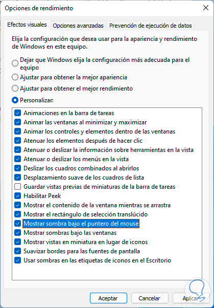 Damos clic en "Configuración" en la sección Rendimiento, luego activa o desactiva la casilla "Mostrar sombra bajo el puntero del mouse". Aplica los cambios.