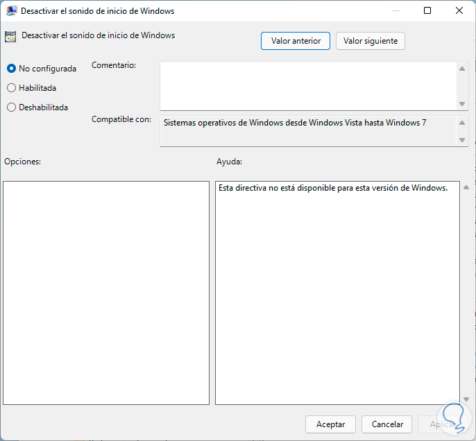 Abre la política "Desactivar el sonido de inicio de Windows" para ver lo siguiente: