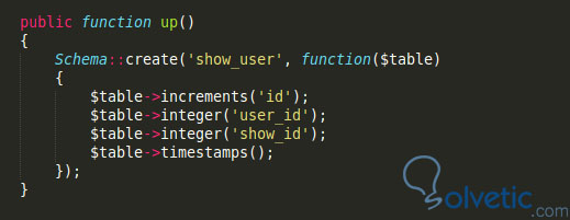 3- Luego en el método up() generaremos los campos de la tabla, con ello cada vez que corramos la migración se creará la tabla: