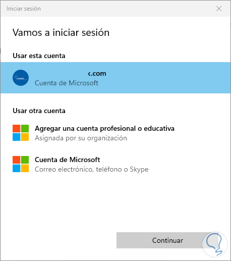 Damos clic en Continuar para ingresar la contraseña de la cuenta:
