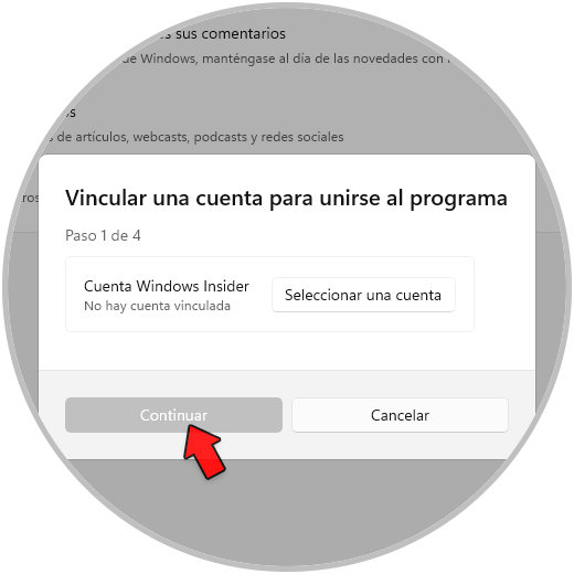 Selecciona la cuenta a vincular al programa Windows Insider: