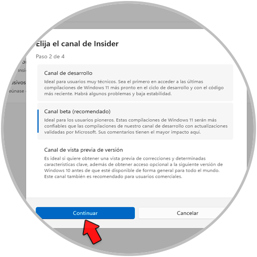 Es momento de seleccionar el canal Insider deseado, en este caso será el canal beta: