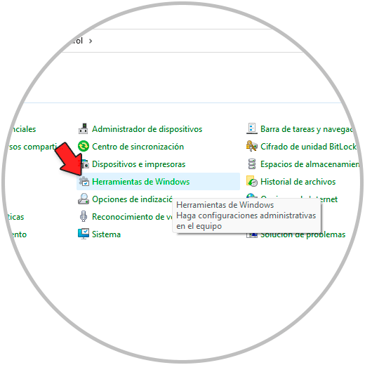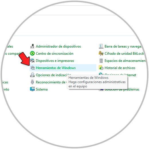 En la ventana del Panel debemos establecer Ver por íconos pequeños y luego dar clic en "Herramientas de Windows":
