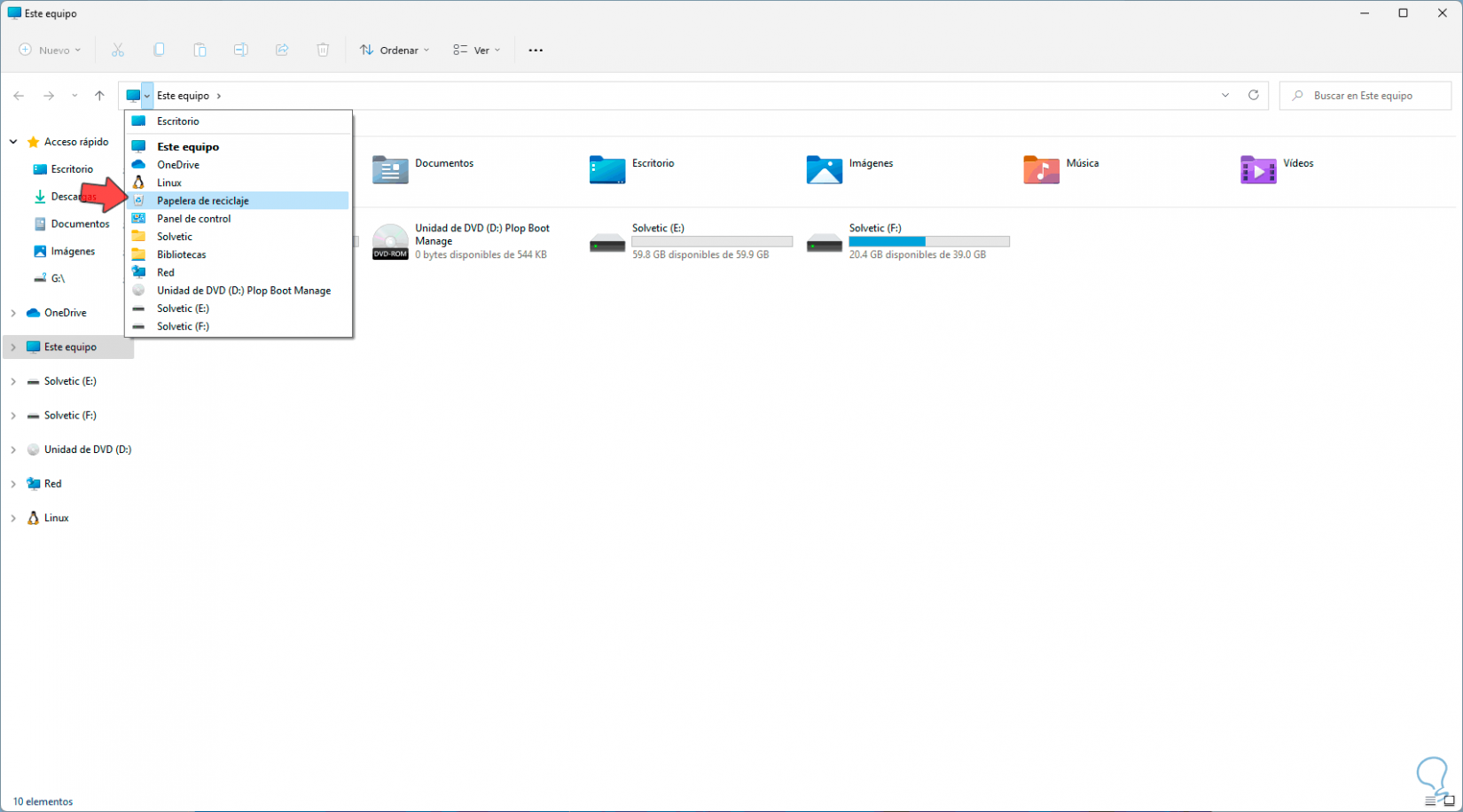 Abre el Explorador de archivos de Windows 11 y en la parte superior accedemos a la Papelera desde el menú desplegado: