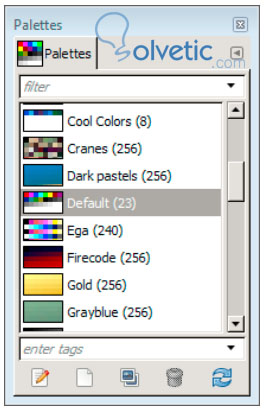 La forma en la que Gimp nos permite trabajar con paletas de color es a través de un cuadro de dialogo donde podremos administrarlas, con ello podremos salvar nuestras paletas personalizadas o utilizar algunas de las que Gimp trae predeterminadas para tener una base para nuestro dibujo.