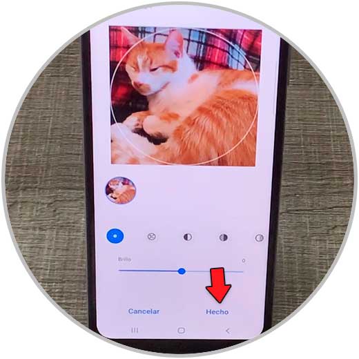 Cuadramos la foto en la esfera moviéndola. En esta pantalla también podrás editar otros aspectos como el brillo. Una vez hayas terminado, pulsa “Hecho” en la parte inferior.