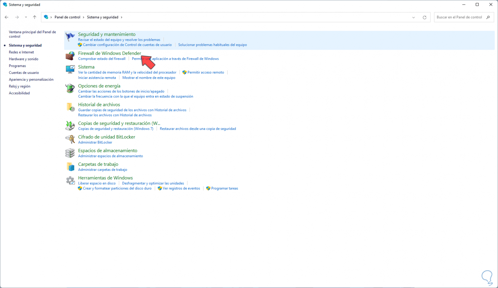 Veremos esto. Allí damos clic en "Firewall de Windows".