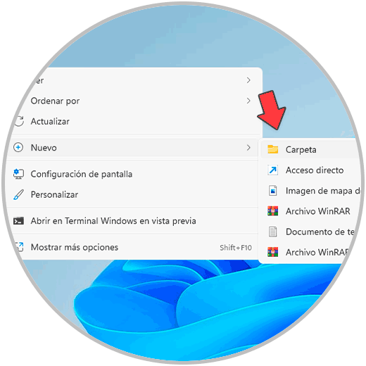 Ahora, damos clic derecho en el escritorio y seleccionamos la opción "Nuevo -Carpeta":