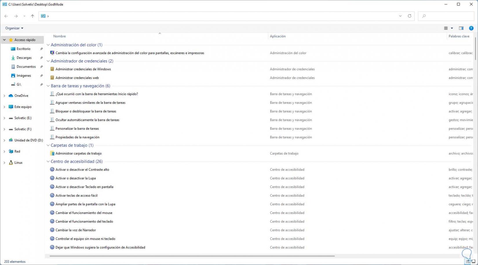 Su nombre tiene un impacto al enterarnos que en esta carpeta tendremos acceso a todas las opciones de configuración del sistema y veremos algunas que no están disponibles por defecto en el Panel de Control, por lo general encontramos alrededor de 200 accesos directos divididos en 36 categorías o más.