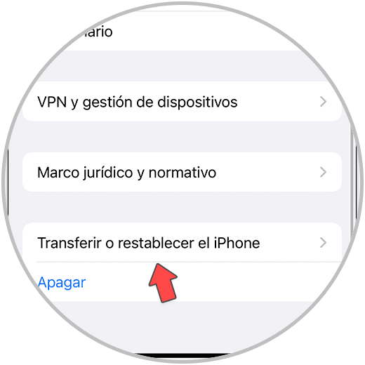 Aquí bajamos y pulsamos en "Transferir o restablecer el iPhone"