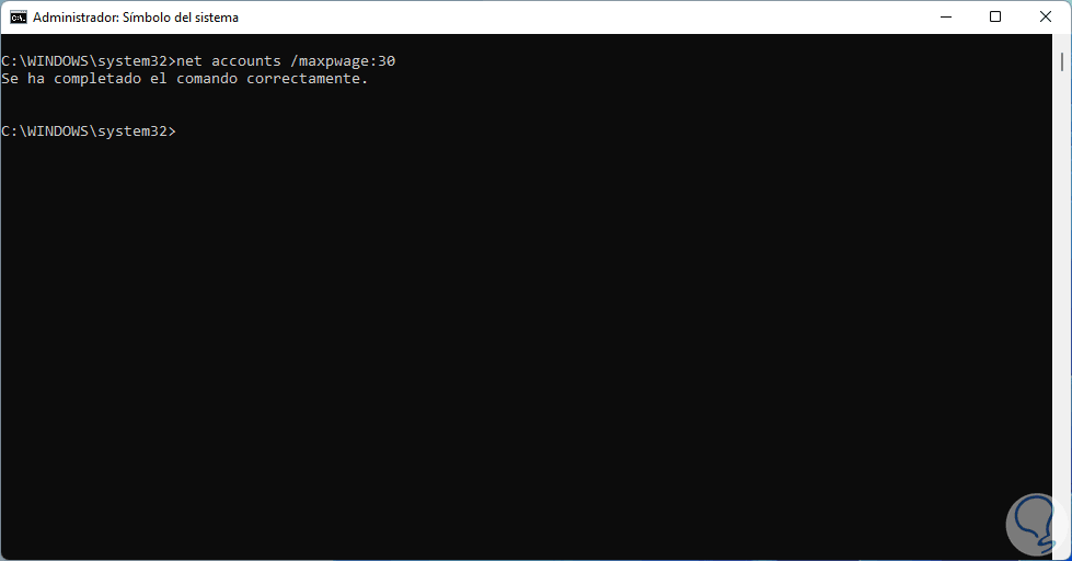 Ahora es momento de establecer los días permitidos con una contraseña, después de este día se solicitará el cambio de contraseña, para ello ejecutamos el comando: