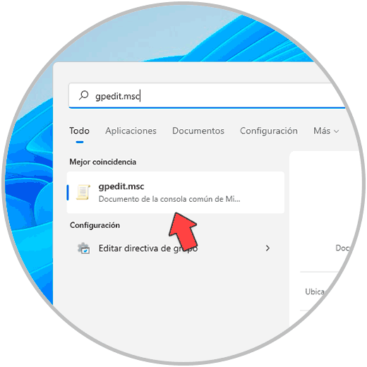 La siguiente opción a usar en Windows 11 para realizar el cambio de contraseña es a través de las políticas de grupo, en este caso en el buscador ingresamos "gpedit.msc":