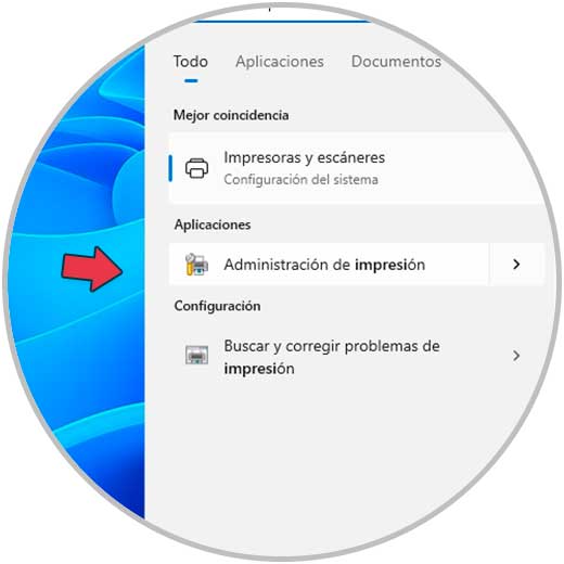 En el buscador de Inicio ingresa "impres", seleccionamos "Administración de impresión". Esto abrirá el administrador de impresión.