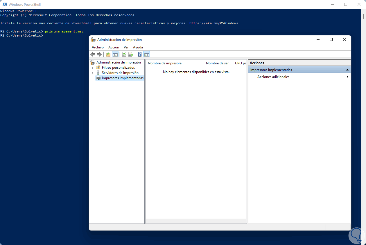PowerShell es una consola poderosa con cientos de cmdlets para trabajar en Windows 11 pero nos da la oportunidad de abrir el Administrador de impresión desde allí, abre PowerShell: