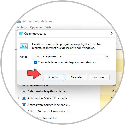 Ingresamos el comando "printmanagement.msc" y activamos la casilla "Crear esta tarea con privilegios administrativos":