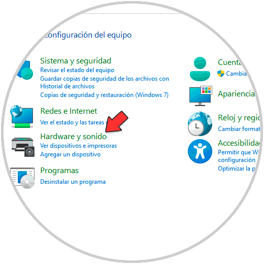 Veremos lo siguiente. Damos clic en "Hardware y sonido"